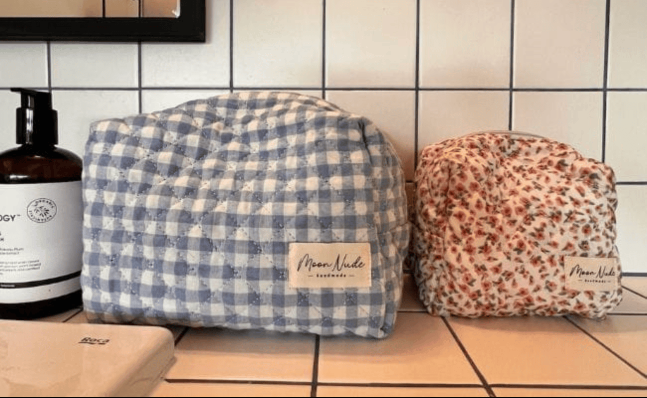 The quilted exterior boasts a beautiful floral pattern, complemented by the classy blue gingham interior.