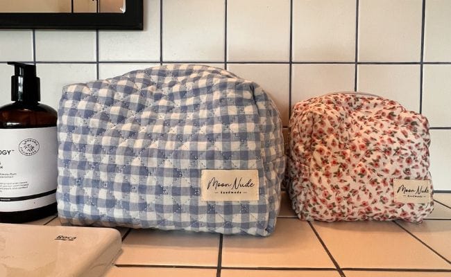 The quilted exterior features a beautiful strawberry-themed pattern, complemented by a classy pink gingham interior.